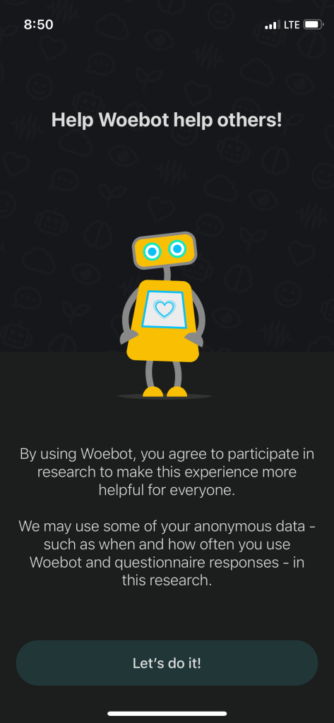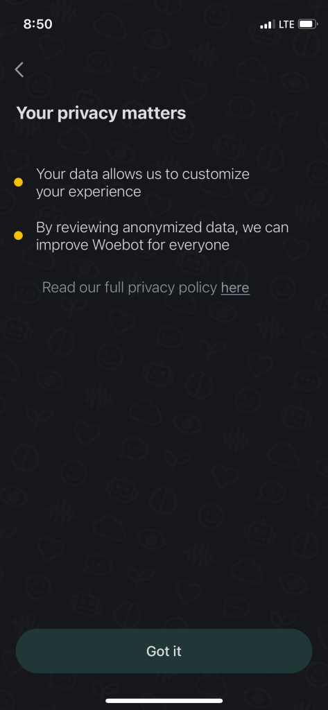 Given this description of Woebot, the writers of the aforementioned scoping review of chatbots in mental health likely categorized this Woebot as being one of the 92.5% of chatbots that did not utilize a Machine Learning Approach (Abd-alrazaq et al. 2019, 5). Based on the following interactions with Woebot, it would be difficult to get the impression that the technologies that comprise it are “intelligent” per se. Which is not necessarily to say that the app isn’t clearly collecting and using user information—it clearly is, and is very upfront about doing so (see images below)—but it appears that the data collected is used more for the design of better decision trees and better decision responses.