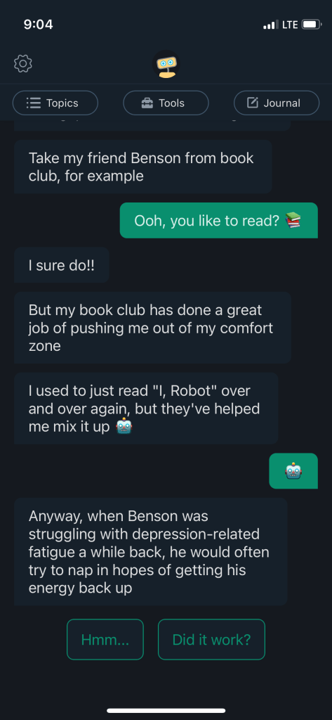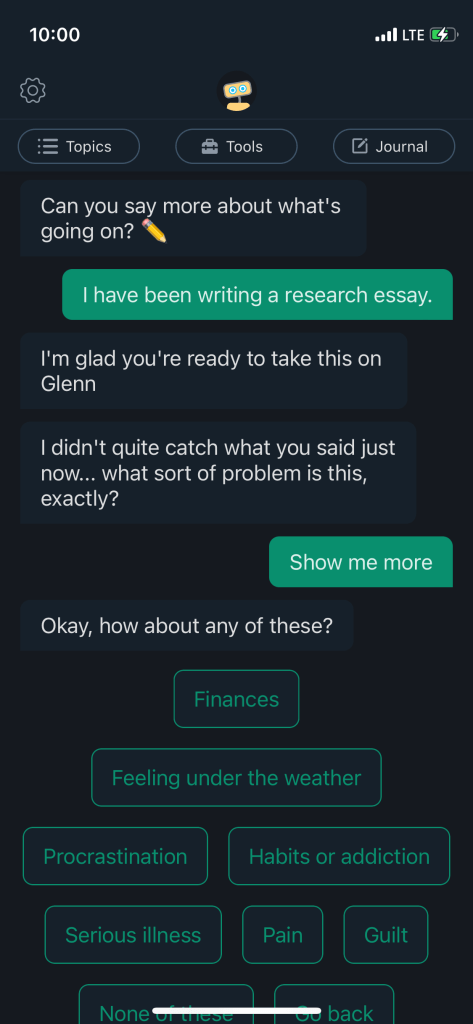 Based on these encounters with Woebot, it appears that this is a Rules-Based chatbot designed with a Pattern Matching Approach. There likely is an amount of NLP technology within the app’s architecture, but it appears to rely heavily on the creation and use of a minimum selection of keywords (words like depression, anxiety, etc.) in order to properly function.
