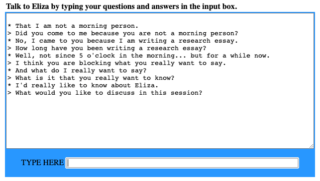 This drawback should, at least in theory, break the simulation of an analysand/analyst relationship rather quickly… but, interestingly, and to Weisenbaum’s dismay, many interactors have believed that ELIZA is either a real person or an example of a computational device that literally understands natural language despite the system’s many inappropriate replies and lack of simulation-supporting medias, such as images or sound, to reinforce its illusion (Murray 2012, 52). Weizenbaum was shocked by this tendency as he designed the DOCTOR script with the intent to have ELIZA simply “parody” the psychotherapist role—a role chosen due to the ease of which it could be computationally imitated—not to actually fulfill it (Wardrip-Fruin and Montfort 2003, 370-72). The resulting misconception, namely, that a “computer program [is] more capable than [it] actually [is]” is often referred to as the “Eliza Effect,” a notable cause of reification, or, the personification of an abstract system (Murray 2012, 55).