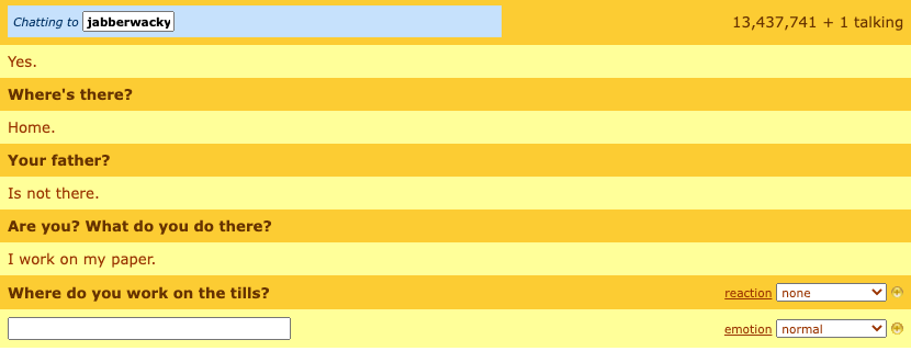 I tried communicating with Jabberwacky but, as you can see in the image below, had little success… I am not sure if it is functioning as-intended or if the outdated website lost some (or all) of the chatbot’s stored data thus limiting the system’s abilities. Regardless, the attempt does show the difficulties that come with implementing “AI” within a chatbot… with limited hard-rules and few pre-written responses, conversation gets derailed quite quickly.