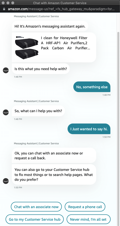 Woebot’s interface is easy to use and familiar, utilizing technologies that have been adapted to work within common messaging apps, and design techniques that can be seen throughout a multitude of websites and apps. Woebot is so familiar, that, looking at the interaction with the Amazon messaging assistant below, one could easily presume that the two technologies are the same or, at least, directly related: Both utilize a limited messenger-style interface, both heavily rely on decision trees, both have a limited ability to parse and respond to free text inputs that do not contain appropriate keywords, and both run into a similar potential for interactor’s to apply inappropriate mental models while participating in the chatbot environment.