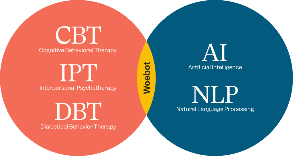 Woebot, the modern combinatorial system at the co-center of this paper, purports that it is powered by “Clinically tested therapeutic approaches,” which includes Cognitive Behavioral Therapy (CBT), Interpersonal Psychotherapy (IPT), and Dialectical Behavior therapy (DBT); and “Sophisticated AI-powered delivery.” Woebot bills this as “AI and NLP,” but, from the above, NLP can simply be understood as technology that falls under the umbrella-term that is AI. In order to deblackbox Woebot as a complete combinatorial system, one must also deblackbox its designers (and marketers) use of the term “AI” and how it is applied in the context.